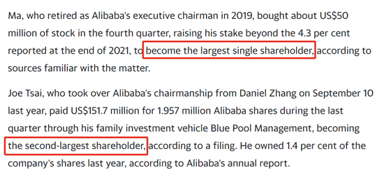 该报道还称,马云在此次增持5000万美元后,持股比例已经高于2021年底的4.3%。这与前面提到的最后一次在财报中4.8%矛盾,而且理论上创始人持股比例每年都需要披露。蔡崇信此前在阿里2023年7月披露的年报中,持股比例为1.4%。