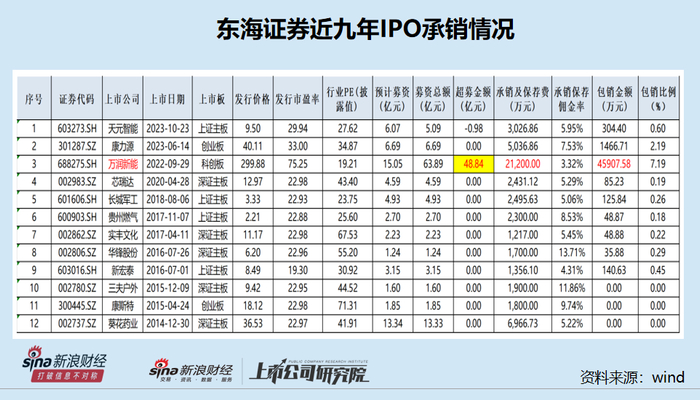 2.12亿元的承销保荐佣金,是东海证券承销万润新能IPO项目前6年合计9家IPO项目的佣金之和,比东海证券2022年度的净利润1.54亿元还高。