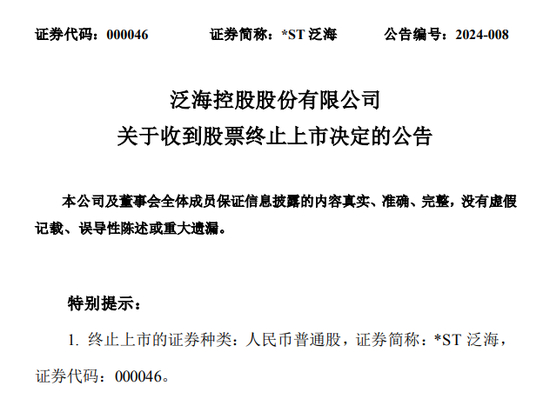 1月27日消息,*ST泛海(000046.SZ,以下简称“泛海控股”)昨日晚间公告,公司收到深交所《关于泛海控股股份有限公司股票终止上市的决定》,深交所决定终止公司股票上市。