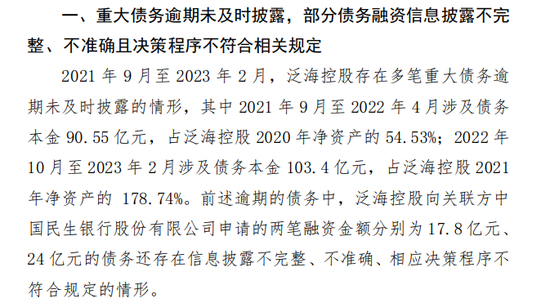 此外,深交所2023年11月30日发布的处分决定显示,2021年9月至2023年2月,泛海控股存在多笔重大债务逾期未及时披露的情形,其中2021年9月至2022年4月涉及债务本金90.55亿元,占泛海控股2020年净资产的54.53%;2022年10月至2023年2月涉及债务本金103.4亿元,占泛海控股2021年净资产的178.74%。