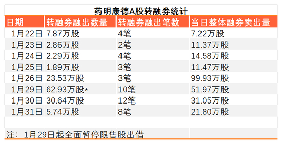 其中,1月29日,药明康德A股转融券融出近63万股,不仅比25日不到2万股的融出规模爆量飙涨30倍,甚至还超过了当天该股真正的融券卖出量(约52万股)。在26日至30日的三天时间,药明康德转融券融出数量累计已超110万股。1月31日,药明康德转融券融出数量又锐减至不到6万股,而次日(2月1日)公司股价走势暂告企稳反弹,截至午间收市涨3.97%。(详见图表2)