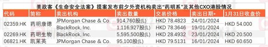 港交所的个股权益披露显示,药明康德(02359.HK)、药明生物(02269.HK)等在1月26日(北京时间)前述美国《生命安全法案》提案内容挂网并发酵前夕,分别被贝莱德(BlackRock, Inc.)、摩根大通(JPMorgan Chase & Co.)卖出,交易价格比1月底大跌后的股价要高出三到五成。