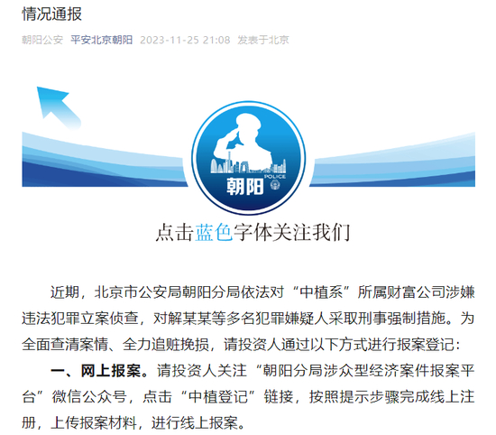 随后,据平安北京朝阳官微消息,北京市公安局朝阳分局依法对“中植系”所属财富公司涉嫌违法犯罪立案侦查,对解某某等多名犯罪嫌疑人采取刑事强制措施。