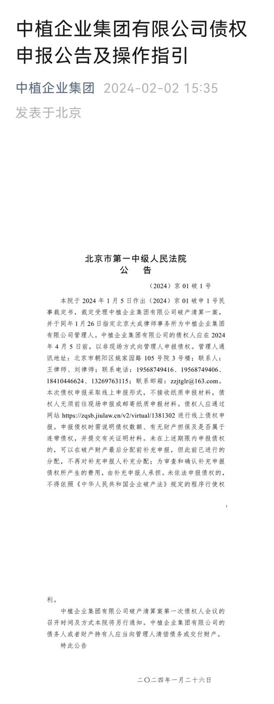 2月2日下午,停止更新4个月的“中植企业集团”官微推送《中植企业集团有限公司债权申报公告及操作指引》。