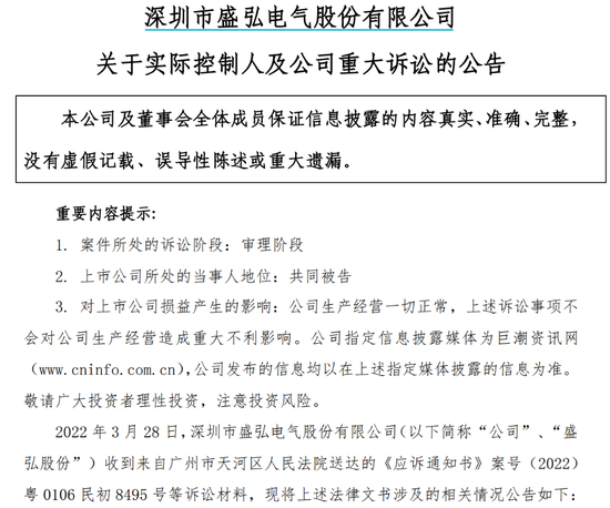 盛弘股份实控人与原股东之间的股权代持纠纷,最早由上市公司在2022年3月29日一份公告中披露。当时距离盛弘股份上市,已有超过4年半时间。