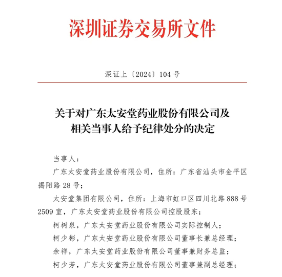 2月6日,深交所发布《关于对广东太安堂药业股份有限公司及相关当事人给予纪律处分的决定》。