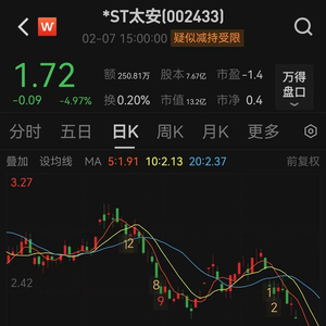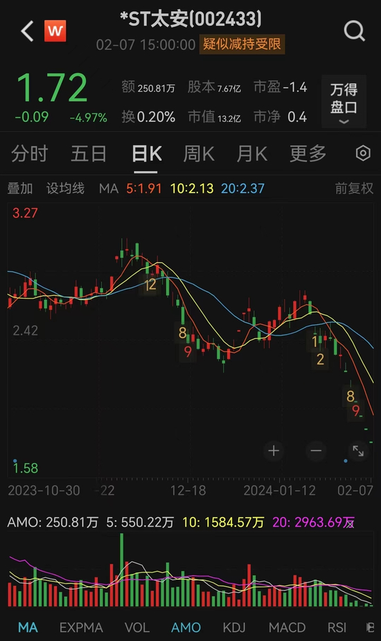 2月7日,*ST太安再度一字跌停,收报1.72元/股,下跌4.97%。近日,*ST太安连续6个交易日跌停,最新市值约13.2亿元。