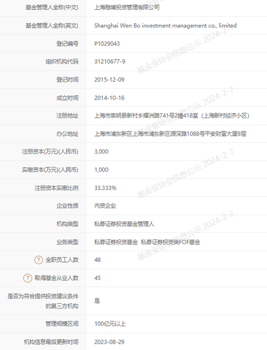 截至目前,中基协列示的证券投资类百亿私募数量仅有99家,而拼音简称相符的有且仅有一家——上海稳博投资管理有限公司(简称:稳博投资)。