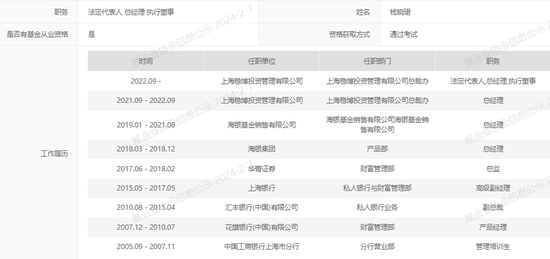 据中基协备案信息,稳博投资的法定代表人、总经理、执行董事钱晓珺,早年曾在工商银行、花旗银行、汇丰银行和上海银行任职。他于2017年加入初创的华菁证券(现为华兴证券),曾任财富管理部总监。2018年,他入职海银集团,曾任产品部总经理,并在2019年1月至2021年8月期间担任海银基金销售有限公司(简称:海银基金)总经理。