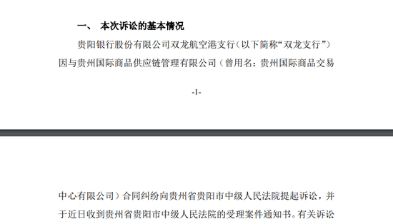 2月7日晚间,贵阳银行(601997.SH,股价5.46元,市值199.63亿元)发布关于诉讼事项的公告 。公告称,贵阳银行股份有限公司双龙航空港支行(以下简称“双龙支行”)因与贵州国际商品供应链管理有限公司(曾用名:贵州国际商品交易中心有限公司)合同纠纷向贵州省贵阳市中级人民法院提起诉讼,并于近日收到贵州省贵阳市中级人民法院的受理案件通知书。
