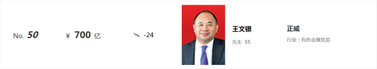 到2023年,王文银在胡润百富榜的排名下降至第50位,财富值缩水到700亿元。