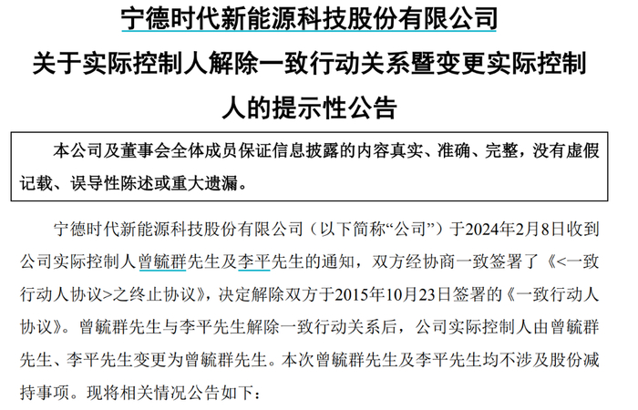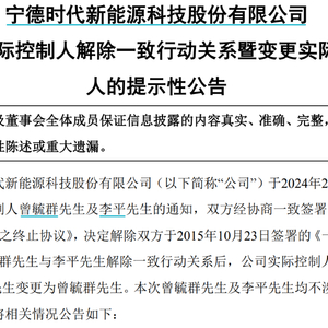宁德时代2月8日晚间公告显示,该公司收到实际控制人曾毓群及李平的通知,双方经协商一致签署了《<一致行动人协议>之终止协议》,决定解除双方于2015年10月23日签署的《一致行动人协议》。