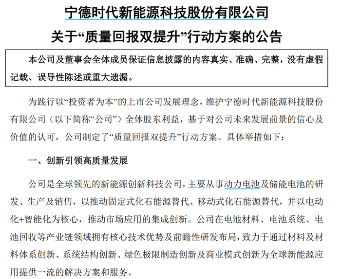 就在同一天,宁德时代公告了一份名为“质量回报双提升”的行动方案。宁德时代着重表示,将继续通过创新引领高质量发展,坚守以投资者为本,重视投资者回报,为投资者创造长期价值。