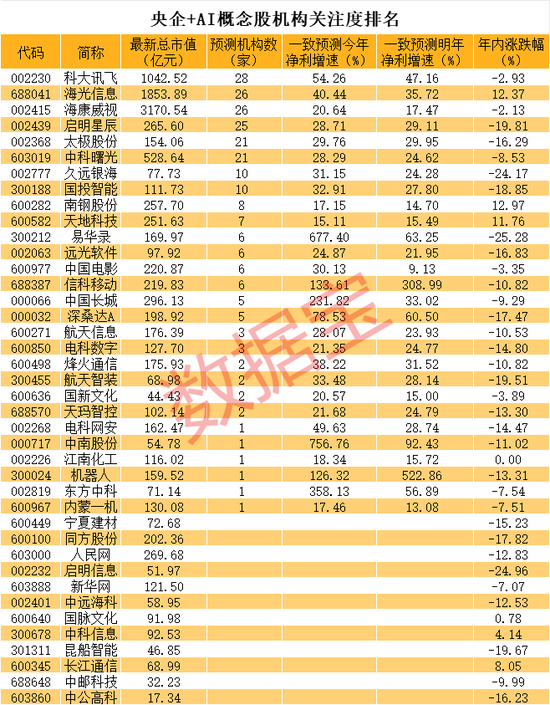 A股具有人工智能概念的央企合计有40家,海康威视、海光信息、科大讯飞等公司市值超过千亿元,中科曙光、中国长城、人民网等公司市值超过百亿元。规模最小的是中公高科,不足20亿元。此外,中邮科技、国新文化、昆船智能等公司市值不足50亿元。