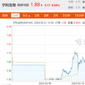 上述董事长变更的消息公布后,宁科生物在2月20日、2月21日迎来两连涨,21日更是迎来涨停板,当日收盘价为1.88元/股,总市值约12.88亿元。