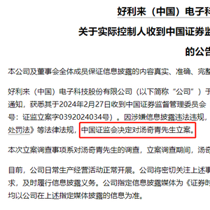 2月27日晚间,A股上市公司好利科技公告称,于2月27日收到公司实际控制人、董事汤奇青通知,获悉其于2024年2月27日收到中国证监会下发的《立案告知书》。