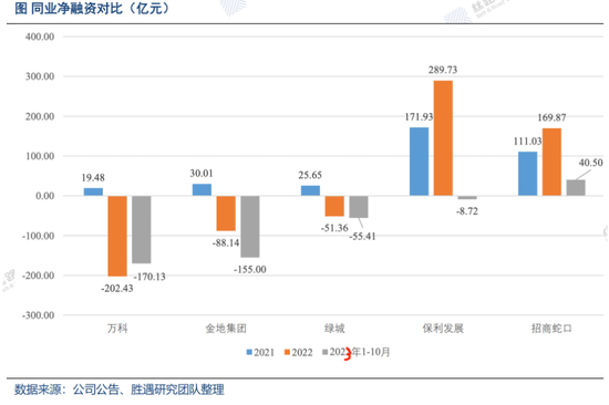 据胜遇研究,万科2021年到2023年10月之间,净融资远低于保利和招商蛇口等央国企。