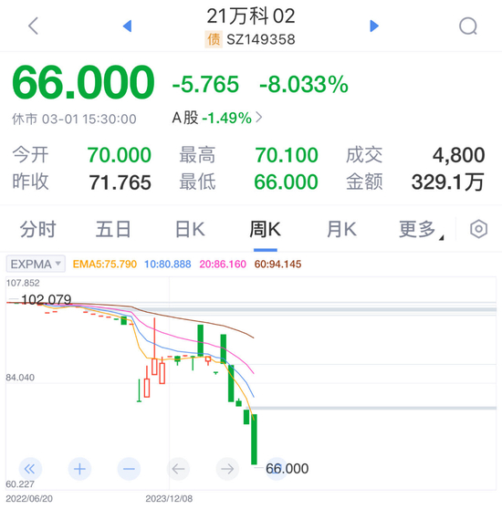21万科02跌至 67.97 元,周跌幅达 9.4%;22 万科 05 跌至 74.19 元,周跌幅达 9.2%。