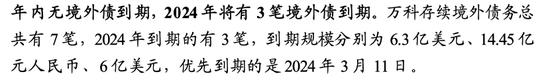 根据国泰君安的研究,万科2024年在境外一共有三笔债务到期,其中一笔是6.3亿美元,也就是45亿人民币,到期时间是3月11日。