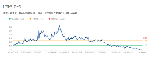 目前,万科的市净率仅为0.46,是十年最低水平。