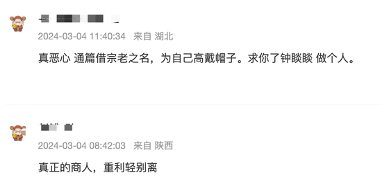 但从目前来看,除了消费者,还有很多投资者依然对钟睒睒的回应不买账。有投资者认为,钟睒睒“通篇借宗老之名,为自己高戴帽子。”也有投资者认为,这是“真正的商人,重利轻别离”。