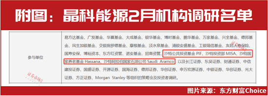 上市公司公告显示,2月,沙特公共投资基金(PIF)、沙特投资部(MISA)、沙特国家养老基金(Hassana)和沙特阿拉伯国家石油公司(Saudi Aramco)集体现身晶科能源的机构调研名单(见附图)。