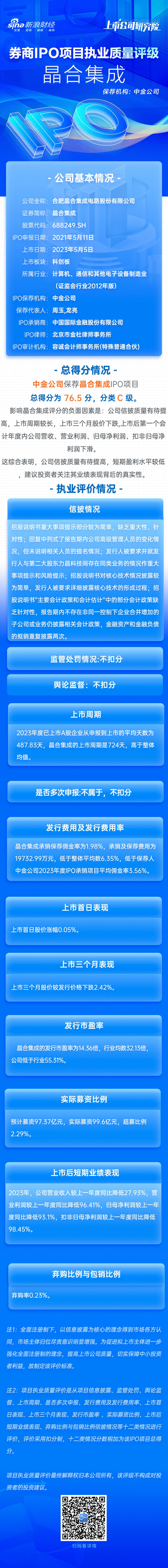 晶合集成IPO项目总得分为76.5分,分类C级。影响晶合集成评分的负面因素是:公司信披质量有待提高,上市周期较长,上市三个月股价下跌,上市后第一个会计年度内公司营收、营业利润、归母净利润、扣非归母净利润下滑。这综合表明,公司信披质量有待提高,短期盈利水平较低,建议投资者关注其业绩表现背后的真实性。