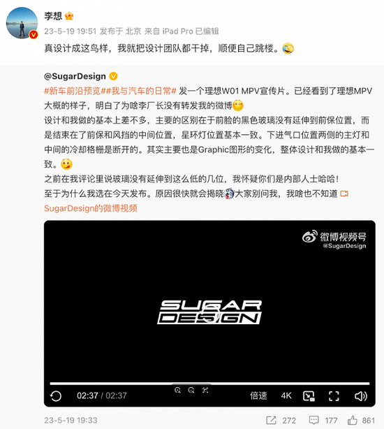 早在2023年,有博主发出对于理想MEGA的设计猜想,李想直接回应:“真设计成这鸟样,我就把设计团队都干掉,顺便自己跳楼。”而后来实车图公布,不少网友认为理想MEGA的设计与微博博主制造的渲染图差别不大。