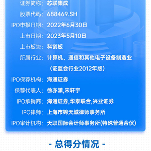 芯联集成IPO项目总得分为75分,分类C级。影响芯联集成评分的负面因素是:公司信披质量有待提高,实际募资金额缩水,上市三个月股价下跌,上市后第一个会计年度公司营业利润、归母净利润、扣非归母净利润亏损扩大。这综合表明,公司短期内盈利能力有待提高,信披质量有待提高,建议投资者关注其业绩表现背后的真实性。