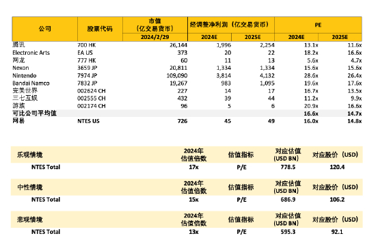 估值&目标价:网易当前估值与可比公司基本相当,估值高于腾讯,乐观情境下,给予网易2024年17xP/E估值,6个月维度乐观目标价120美元,中性情境下,给予网易2024年15xP/E估值,6个月维度中性目标价106美元,悲观情境下,锚定13x P/E进行估值,6个月维度悲观目标价92美元