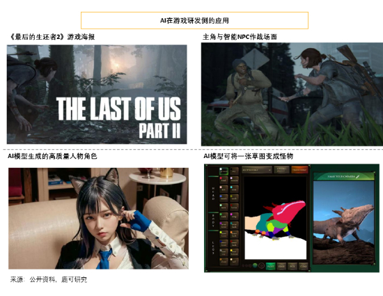 游戏发行端&商业化端应用:1)在发行端,AI可以辅助营销人员素材创意生产和内容精准性提升,不断推动营销内容的生产效率,在数量上可以生成大量营销素材,在本地化上可以A1翻译等功能针对不同国家的营销素材及文案做快速的本地化。2)在商业化端,传统游戏中用户攻击NPC或与电脑战斗过程中,电脑决策相对简单,应用AI后游戏世界内各种玩家之外的素材均可对攻击进行一定的灵活反应,提升用户的可玩性及付费欲望
