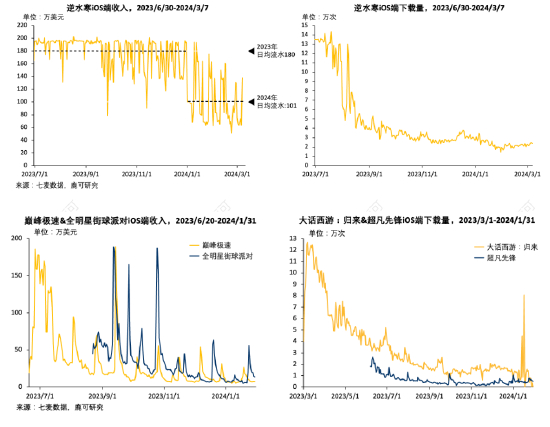 但《逆水寒》下载量不断走低,流水已无法维持此前的高位,2024年预计贡献流水约88亿元。逆水寒23年Q3+Q4日均流水为180万美元,但2024年开年流水已开始不断降低,2024年至今(3月7日)日均流水为101万美元,2024年年流水或将面临较大幅度下降,预计全年流水约为88亿元。
