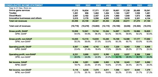四季度网易整体营收271亿元,同比增长7%,略低于市场预期,non-GAAP净利润同增53%达到73.8亿元,同样低于市场预期,其中游戏业务收入同比增长12%,有道收入小幅增长2%,而网易云音乐收入仍为负增长,网易四季度核心财务数据如下: