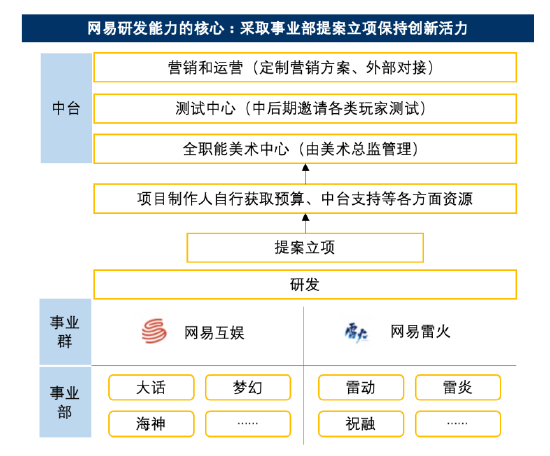但在国内,事业部提案立项制度使得网易具备创新活力,国内游戏基本盘稳固:腾讯采取自上而下的立项方式,有利于发挥自身流量和渠道优势,而网易采取自下而上的立项方式,游戏工作室为核心创作动能。