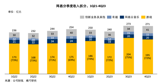 公司简介:网易2023年实现收入1,035亿元、non-GAAP净利润326亿元,70%以上收入来自游戏,净利润基本来自于游戏业务,有道、云音乐等难以贡献利润,游戏是网易的核心矛盾