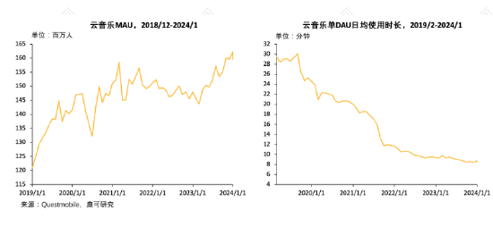 云音乐扭亏,2023年实现盈利。网易云音乐2023收入达到人民币78.7亿元,同比增速-13%,但调整后净利润为8.2亿元,在此前亏损不断减小的情况下实现盈利。目前,网易云音乐MAU上升明显,用户月均使用时长保持稳定,良好的社区氛围使其保持着强用户粘性及活跃度,2022年付费率同比提升4.4 pct至 20.2%,2023年付费率同比提升1.2pct达到21.4%。