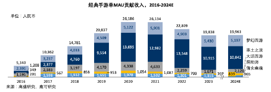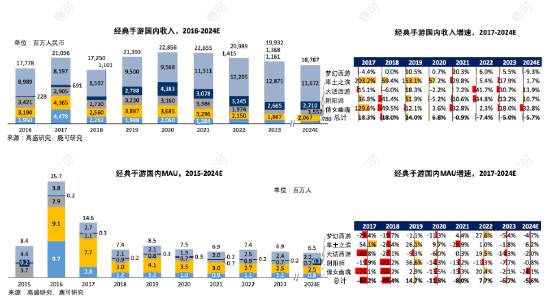 老游戏表现:《梦幻西游》、《大话西游》等经典游戏生命周期长,但收入已开始缓慢下滑,预计2024年收入继续下滑5.7%网易具备较强长线运营能力,2015及2016年上线的五款经典的手游多年来国内流水下滑较为缓慢,流失部分用户,单MAU付费意愿较高。