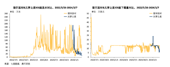 蛋仔派对的主要竞争对手是腾讯2023年12月中旬推出的元梦之星,元梦之星首月流水超过同期的蛋仔派对,但未达10亿预期。元梦之星首月i0S端流水约1.9亿元,超过蛋仔派对同期的0.9亿元,但按i0S和安卓渠道的收入比例接近1:3计算收入约为7.6亿元。