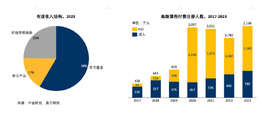 有道收入主要来自于学习服务,“双减”后逐步完成转型,专注 STEAM 和成人及职业课程,预计2024年盈利。有道2023年non-GAAP OP约-4.4亿元,后续有望因成人注册课程数增加在2024年实现盈利。