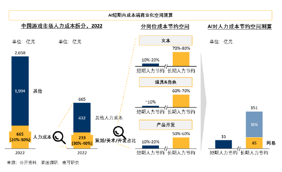 我们预计A!在游戏成本端及商业化端均有一定的商业化空间,从成本端来看,在生产环节的文本生成、道具角色生成及产品生成等部分,可以节约游戏策划/美术/开发等人员成本。经我们初步测算,2022年全国游戏市场规模2,658亿元,根据渠道反馈,其中人力成本占20%-30%,而在人力成本中,策划、美术及开发人员合计占比30%-40%,这部分人员成本合计占约230亿元,当前AI对这部分人员的工作替代程度仍在10-20%的较低水准,但行业专家预计长期AI对这部分人力成本的节约可达~70%,对应短期和长期行业成本节约分别为35亿元及150亿元,考虑到网易在国内游戏市场份额~30%长期来看,AI的应用对网易的人力成本节约~45亿元,此处仅考虑人力成本的节约,行业反馈A!在节约人力成本的同时对于这部分开发时间的减少也可达50%-60%