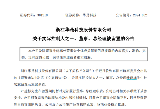 3月14日,华是科技发布公告称,公司近日收到东阳市监察委员会出具的《留置通知书》和《立案通知书》,该公司实控人之一、董事、总经理叶建标被实施留置及立案调查。