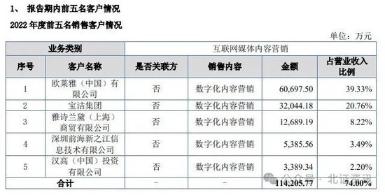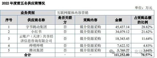 该业务是向互联网内容平台购买流量,销售给广告客户。根据公告,公司主要从抖音、腾讯、小红书和B站采购流量,广告客户主要是宝洁集团、欧莱雅(中国)、联合利华、雅诗兰黛、资生堂等国际一线日用化妆品公司。