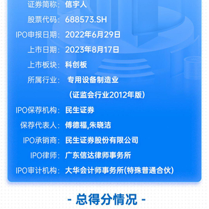 信宇人IPO项目总得分为71分,分类C级。 影响信宇人评分负面因素是:公司信披质量有待提高,发行费用率较高,发行市盈率较高,上市后第一个会计年度公司营业收入、营业利润、净利润、归母净利润、扣非归母净利润下滑。这综合表明,公司短期内盈利能力有待提高,信披质量有待提高,建议投资者关注其业绩表现背后的真实性。