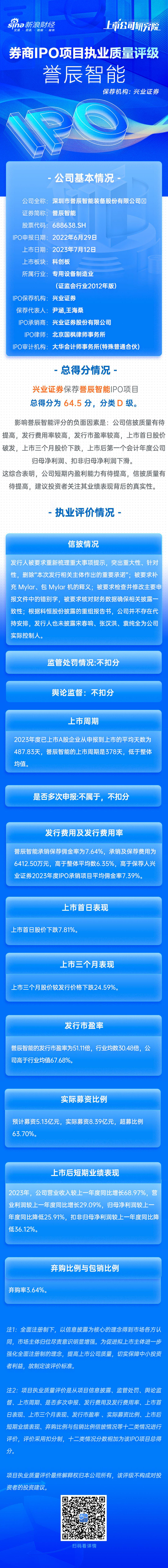 誉辰智能IPO项目总得分为64.5分,分类 D级。 影响誉辰智能评分的负面因素是:公司信披质量有待提高,发行费用率较高,发行市盈率较高,上市首日股价破发,上市三个月股价下跌,上市后第一个会计年度公司归母净利润、扣非归母净利润下滑。这综合表明,公司短期内盈利能力有待提高,信披质量有待提高,建议投资者关注其业绩表现背后的真实性。