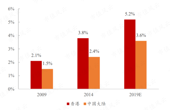 风云君能查到的最近关于中国香港和中国大陆地区的两地对比数据,来自2019年弗若斯特沙利文的数据:中国香港医美渗透率达 5.2%,而中国大陆同期为3.6%。