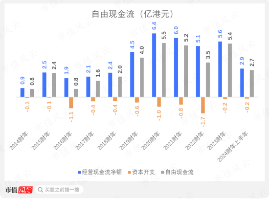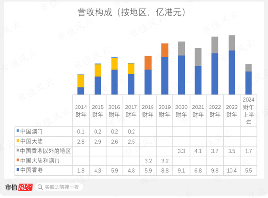 从营收构成的长期趋势看,公司在中国香港的业务大体呈现增长,从2014财年的1.8亿增长至2023财年的10.4亿。2024财年上半年,香港地区营收进一步同比增长11.6%,为5.5亿。