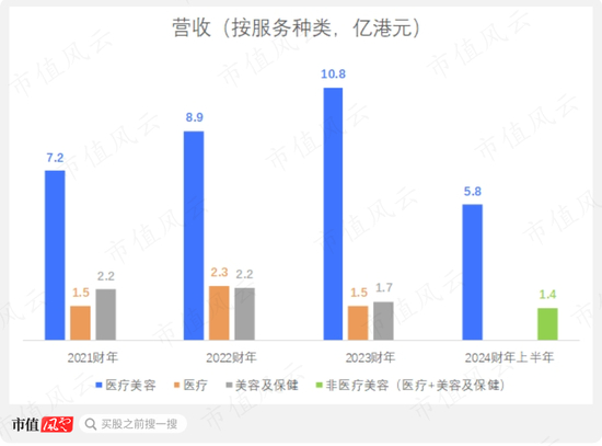 而美容及保健业务的营收,也在不断下滑,从2021财年的2.2亿下滑至2023财年的1.7亿(2024财年上半年将医疗业务和美容及保健业务的经营数据合并在一起,以“非医疗美容项目”的类别进行披露)。