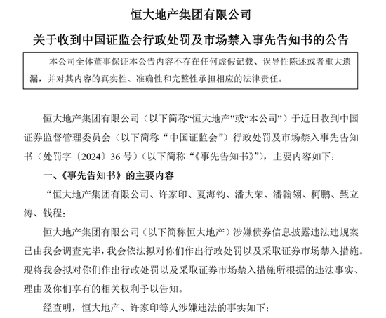 综合起来,恒大地产被处以41.75亿元罚款,许家印被处以4700万元罚款,并被终身市场禁入;夏海钧被罚款1500万元,终身市场禁入;其他责任人被罚款20万元-900万元不等。