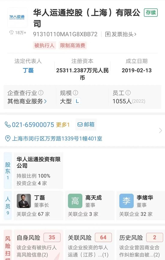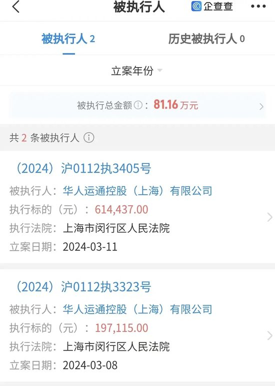 股东信息方面,华人运通控股(上海)有限公司由华人运通投资有限公司全资持股。企查查信息显示,华人运通控股(上海)有限公司现存2条被执行人信息,被执行总金额超81万元。