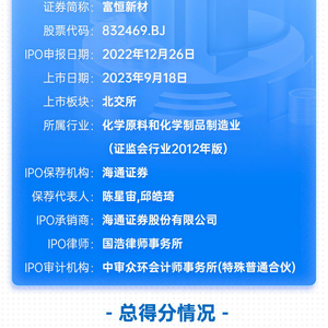 富恒新材IPO项目总得分为80.5分,分类B级。 影响富恒新材评分的负面因素是:公司信披质量有待提高,发行费用率较高,上市三个月股价涨幅过高,实际募资金额缩水。这综合表明,虽然公司短期内业绩表现较好,但信披质量有待提高,建议投资者关注其业绩表现背后的真实性。